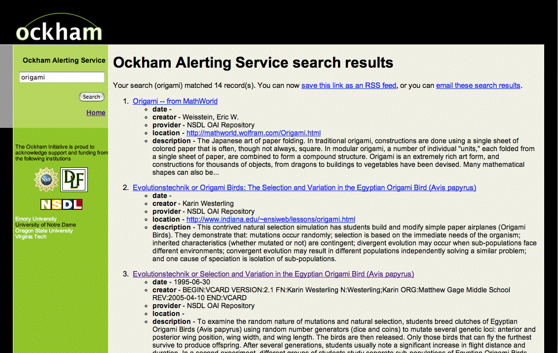 The content for MyLibrary@Ockham is derived from many OAI-PMH repositories and sets. For the purposes of the grant, most of the content comes from NDSL (National Science Digital Library) projects and is supplemented with additional repositories of interest. Again, the harvester is written in Perl but uses an XML file with a locally defined DTD as input. This configuration file denotes from what repositories/sets to harvest as well as what date ranges to use to limit input. This functionality enables the system to harvest only newly added items from repositories, reduces data duplication, and increases network efficiency. The XML file also denotes how the harvested content will be organized by the system, which is described below.