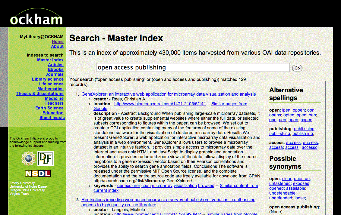 MyLibrary@Ockham also functions correctly, but it too is not perfect. Like the Alerting Service, MyLibrary@Ockham suffers from character encoding problems. More investigation is definitely needed here. Because individual records in the underlying database can be classified with any number of facet/term combinations, and because reports generated against the database combine sets of records in a Boolean union ("or") manner, records are often duplicated in the indexes. A technique needs to be implemented for removing these duplicates. Calculating statistically significant keywords is seamless, but combining each of the five (5) most relevant keywords into a Boolean intersection ("and") search is often too restrictive and rarely identifies more than the currently displayed record. Additionally, phrases are more often seen as more relevant, and our implementation should explore creating relevant phrases as opposed to simply keywords. This needs be addressed in the spelling system as well; the system only spell checks single terms and does not create multi-term queries. The spelling check and finding synonym functions are embedded within the SRU server using extended parameters. Exporting these functions to separate Web Services should be more convenient, accessible, and usable by the whole community but would also increase network latency.